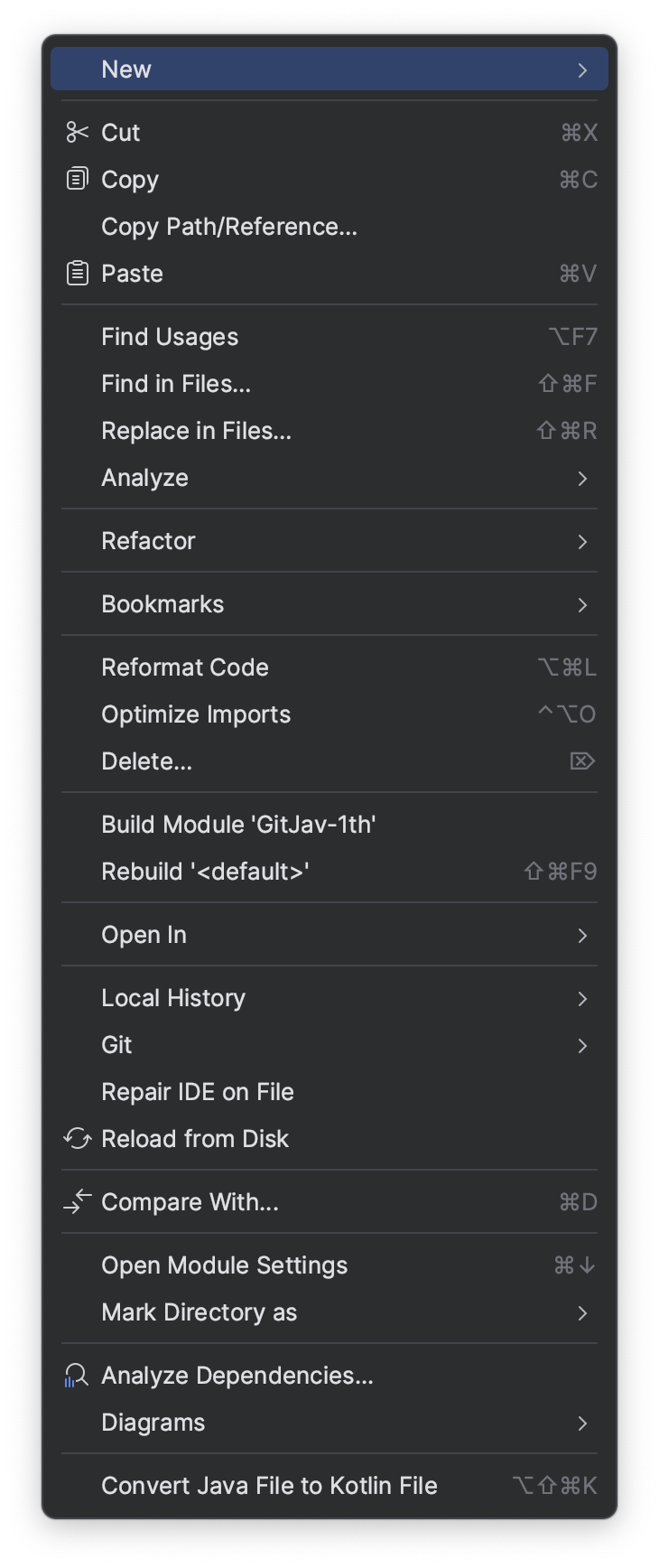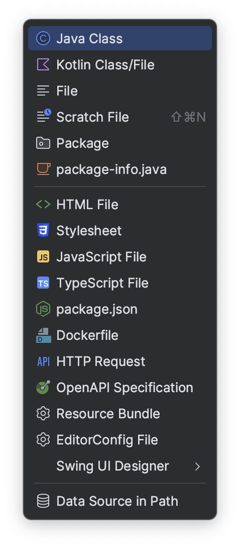 [src/main/java] 디렉토리에서 마우스 우클릭 후 아래와 같이 창이 나타나면 [New -> Java Class] 를 클릭하여 클래스를 생성합니다.