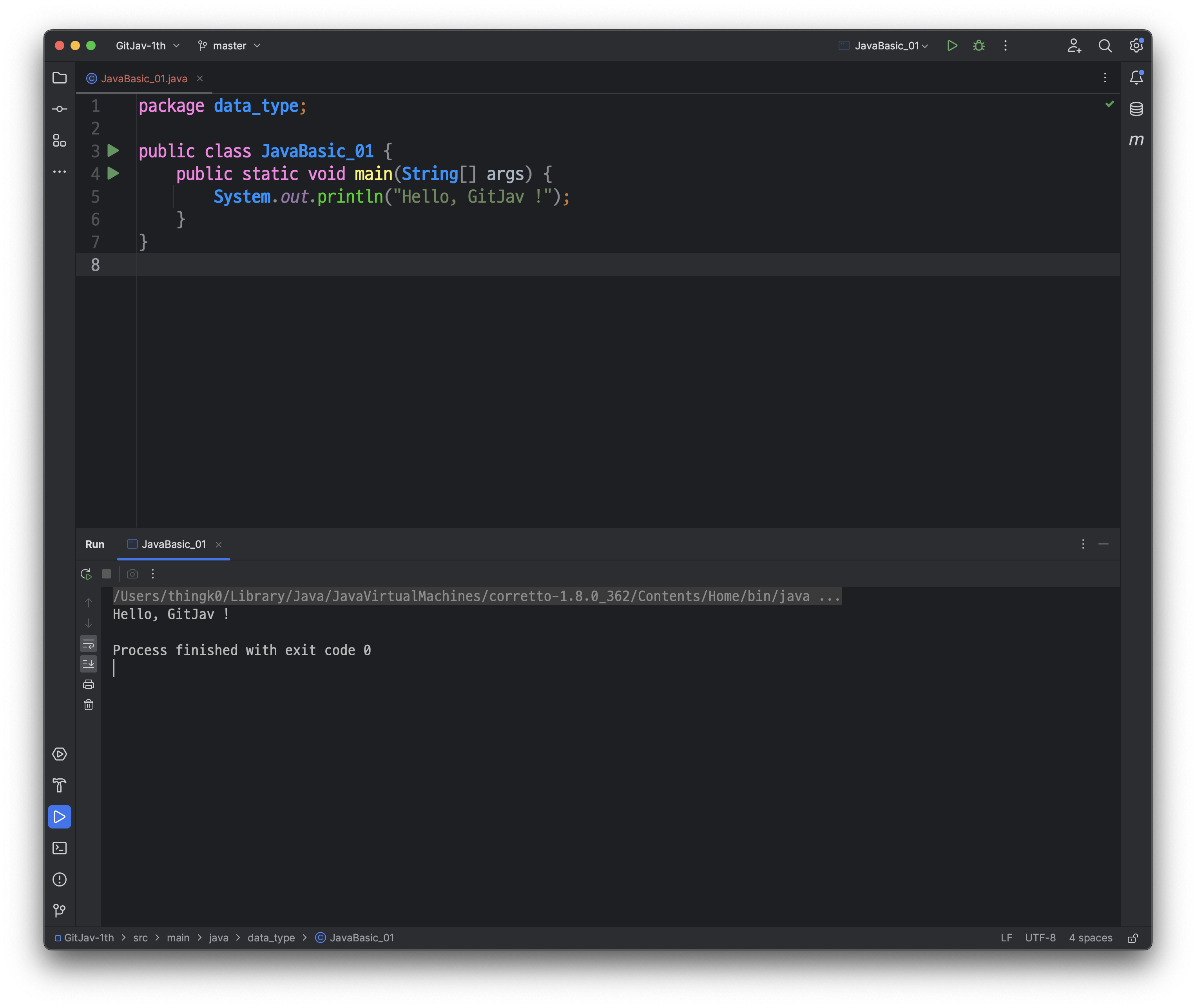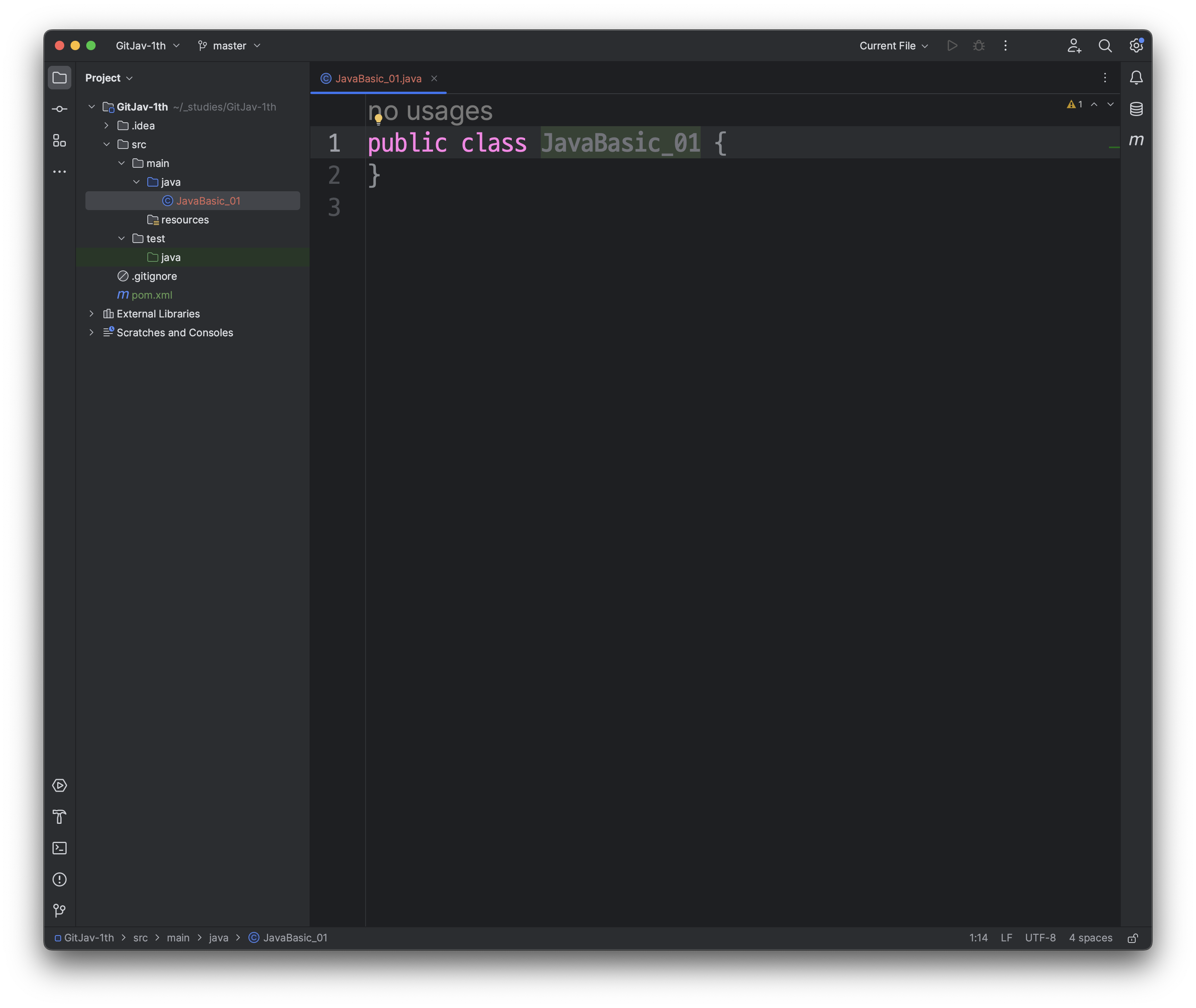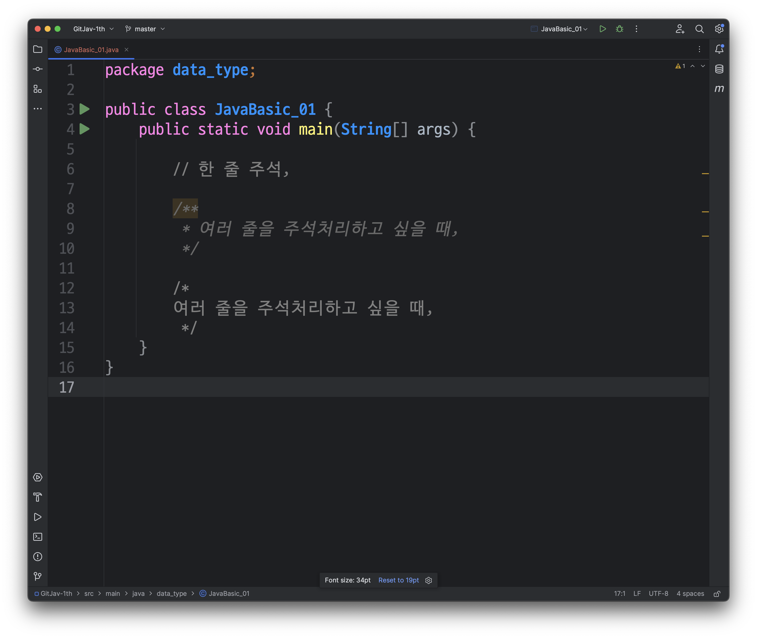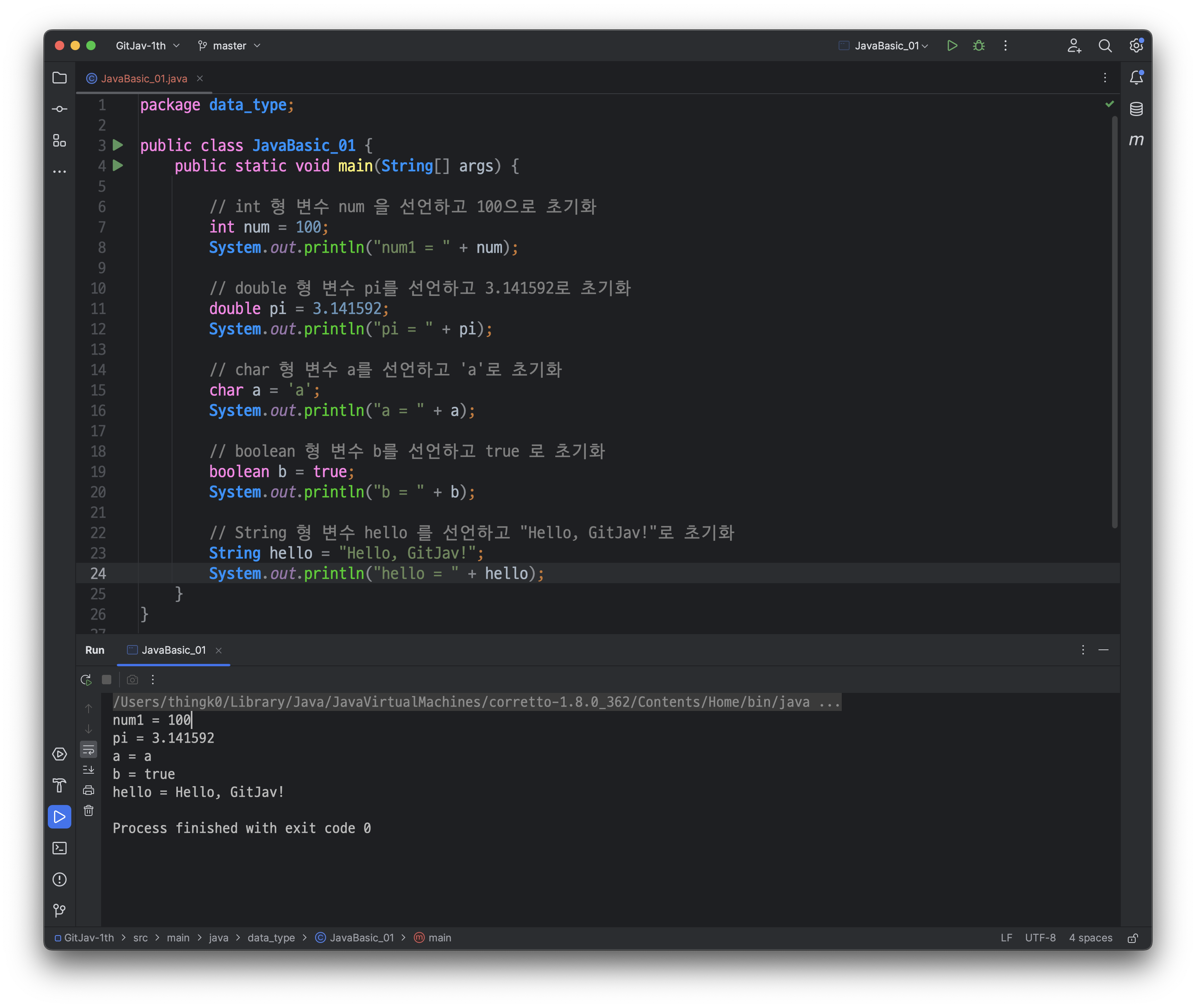 다음과 같이, src/main/java/JavaBasic_01 클래스가 생성된 것을 확인하실 수 있습니다.