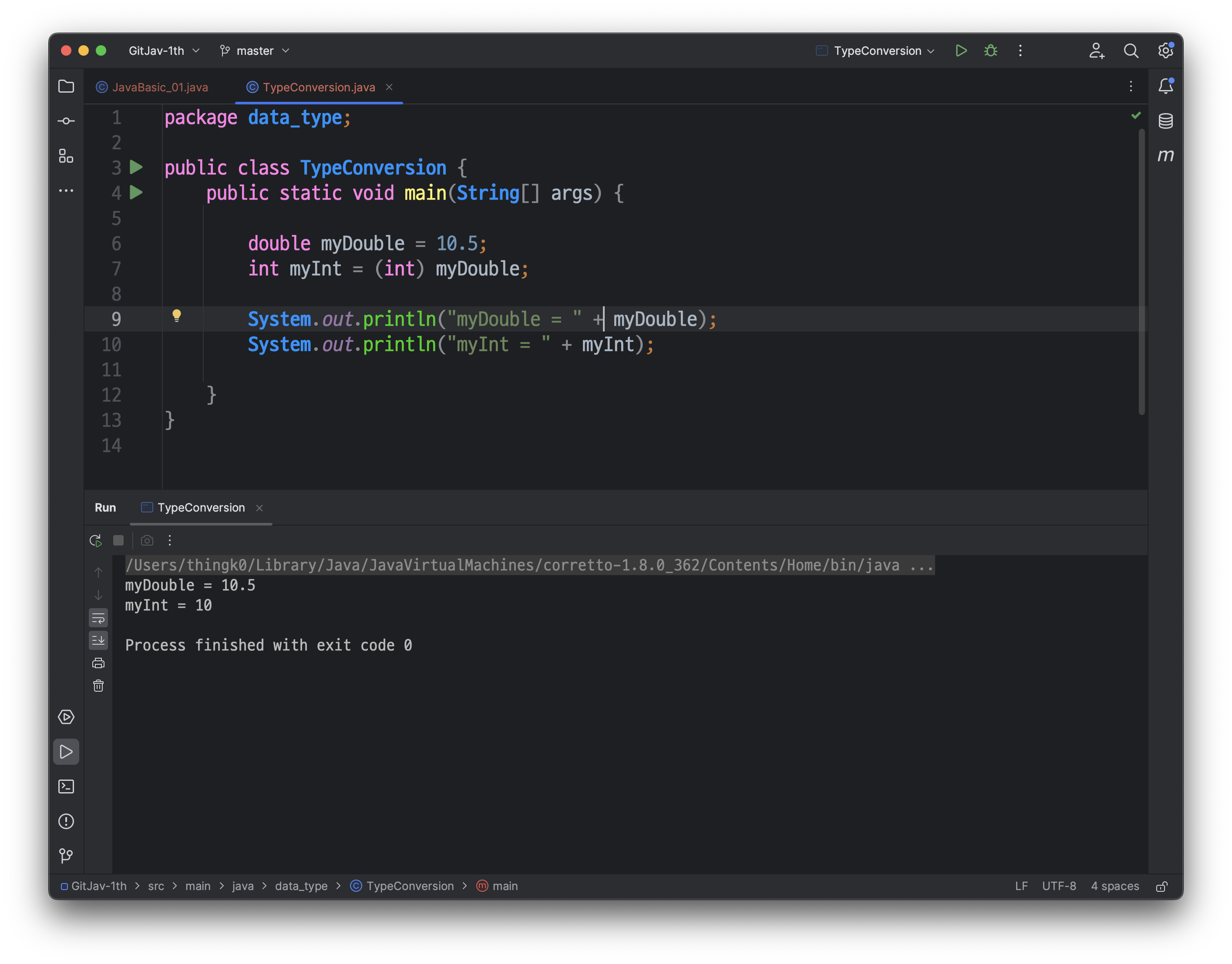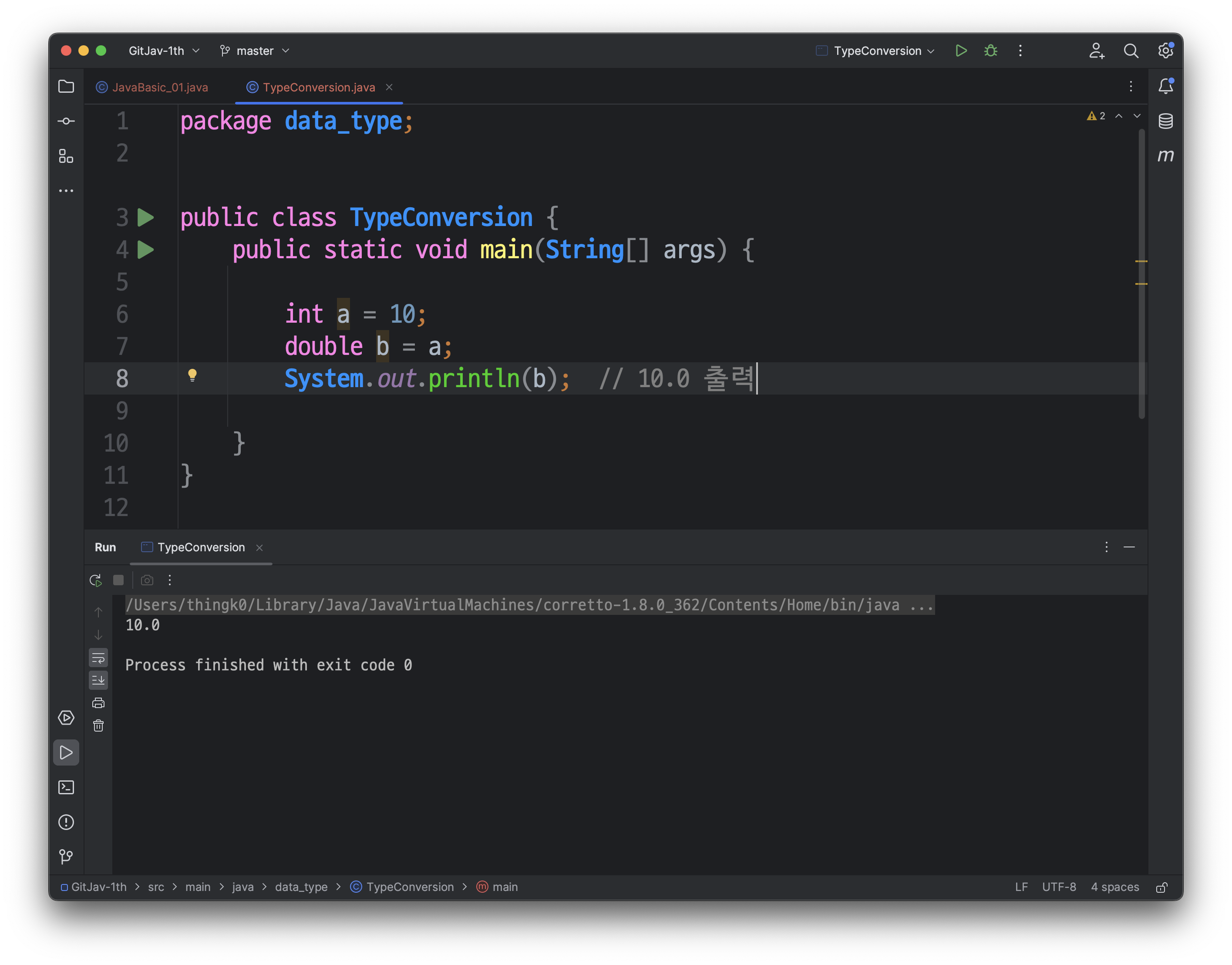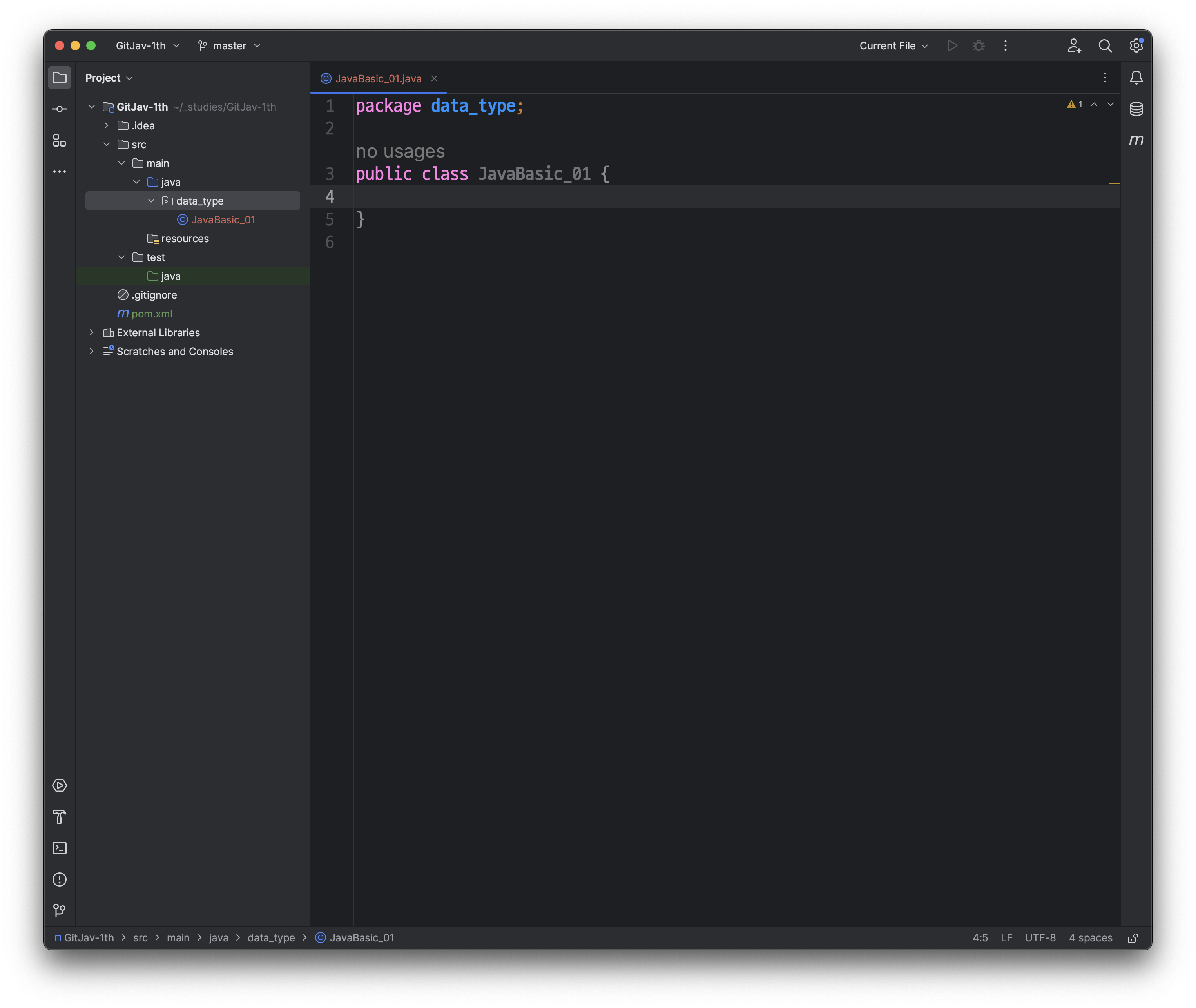 다음과 같이, src/main/java/JavaBasic_01 클래스가 생성된 것을 확인하실 수 있습니다.