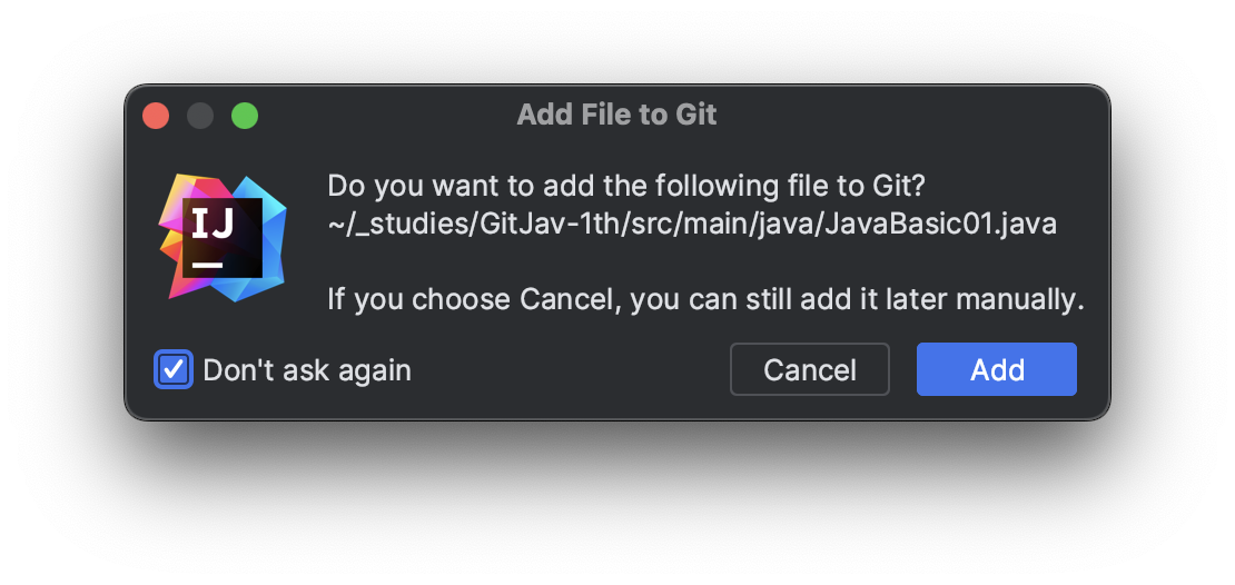 처음 프로젝트를 생성할 때 [Create Git Repository]를 체크했기 때문에 프로젝트는 기본적으로 Git으로 초기화되어 있습니다. 인텔리제이는 기본적으로 Git을 지원하므로 클래스를 생성할 때마다 다음과 같이 새롭게 생성된 파일을 스테이지 할 것인지를 물어봅니다. 이후 문제가 발생하지 않도록 하기 위해 [Don't ask again]을 체크하고 [Cancel]을 눌러 취소하도록 합니다.