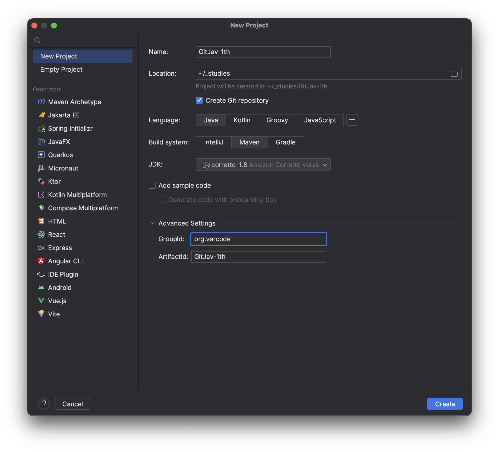 3. 프로젝트의 이름과 저장할 경로를 설정합니다. - Name: Gitjav-1th